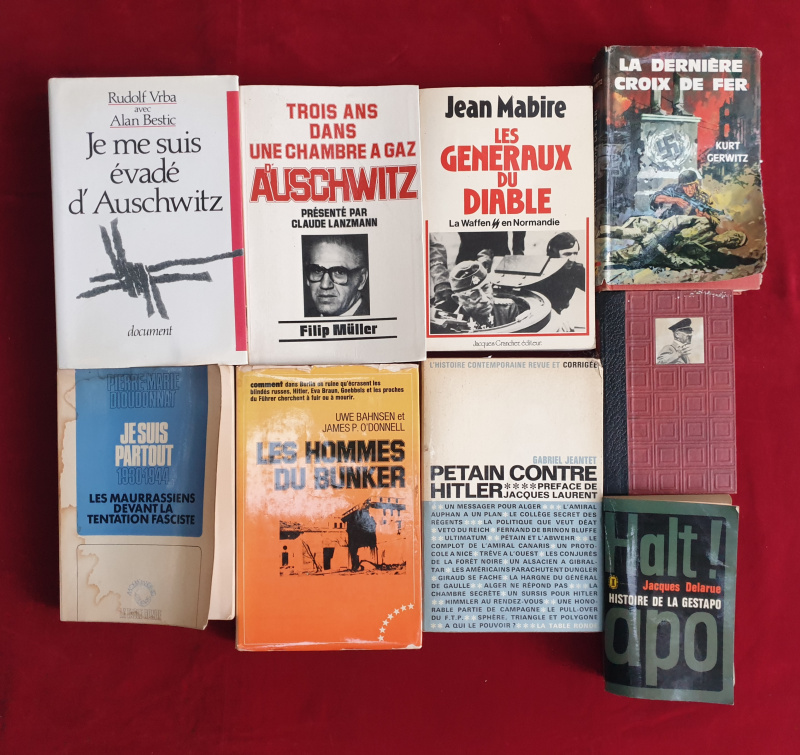 Les généraux du diable Jean Mabire 1987. Je suis partout Pierre Marie Dioudonnat 1973. Je me suis évadé d'Auchwitz Rudolf Urba avec Alan Bestic 1988. Les hommes du bunker Uwe Bahnsen/ James Po Donnel 1976. 3 ans dans une chambre à gaz à Auschwitz Filip Muller 1980. Petain contre Hitler Gabriel Jeantet 1966. Les grandes énigmes de la seconde guerre Mondial Bernard Michal. Histoire de la Gestapo Jacques Delarue 1962. La dernière Croix de Fer Rurt Gerwitz 1966.La division charlemagne Jean Mabire 1974